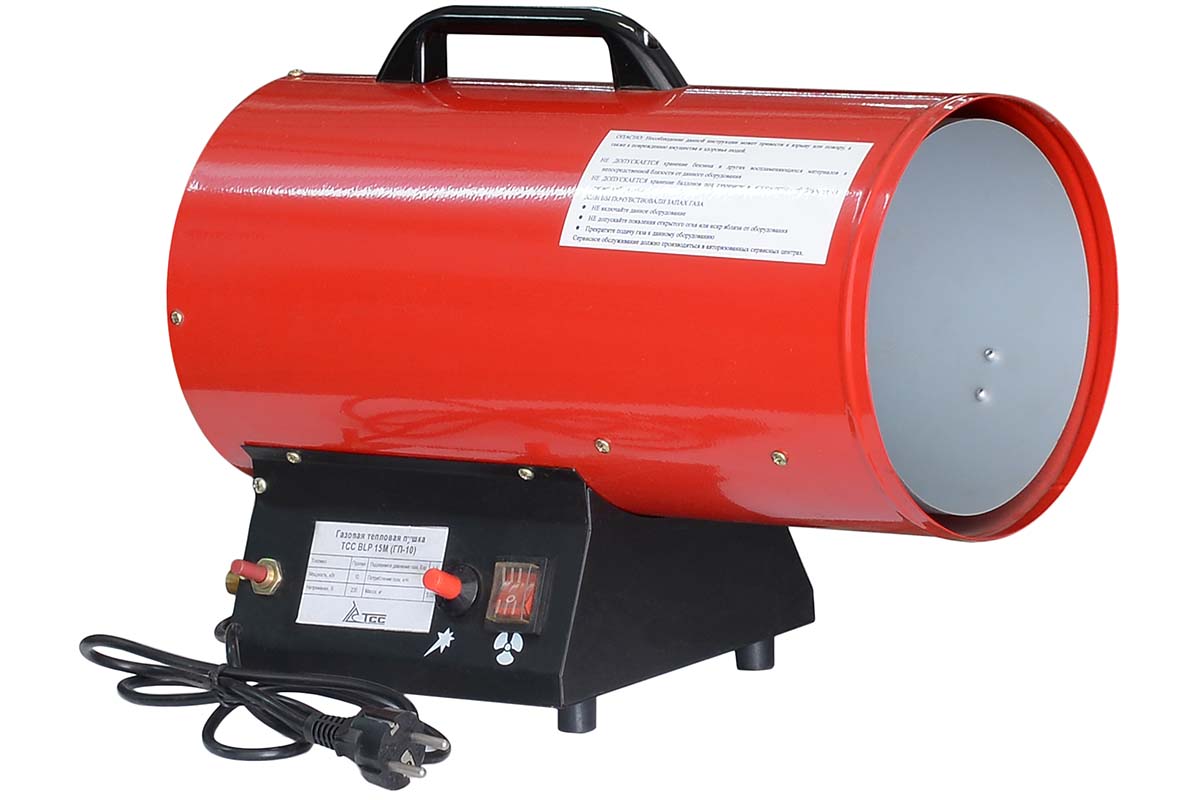 Фирма ТСС; Тепловая мощность 10 кВт; Топливо Пропан; Масса 5,03 кг; Расход топлива 0,78 кг/ч; Габариты ДхШхВ 460х255х345 мм; Давление 1,5 бар; Расход воздуха 300 м3/ч; Номинальное напр. 220 ВГазовые пушки прямого нагрева (без отвода отработанных газов) предназначены для отопления помещений с хорошей вентиляцией для компенсации расхода кислорода. Эксплуатация газовых нагревателей нежелательна в помещениях, где находятся люди или животные.